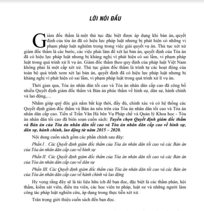 Nhằm giúp quý độc giả nắm bắt kịp thời, đầy đủ, chính xác và có hệ thống các Quyết định giám đốc thẩm và Bản án nêu trên của Tòa án nhân dân tối cao và Tòa án nhân dân cấp cao. Tiến sĩ Trần Văn Hà bên Vụ Pháp chế và Quản lý Khoa học - Tòa án nhân dân tối cao đã biên soạn cuốn sách: Tuyển chọn Quyết định giám đốc thẩm và Bản án của Tòa án nhân dân tối cao và Tòa án nhân dân cấp cao về hình sự, dân sự, hành chính, lao động từ năm 2015 – 2020.