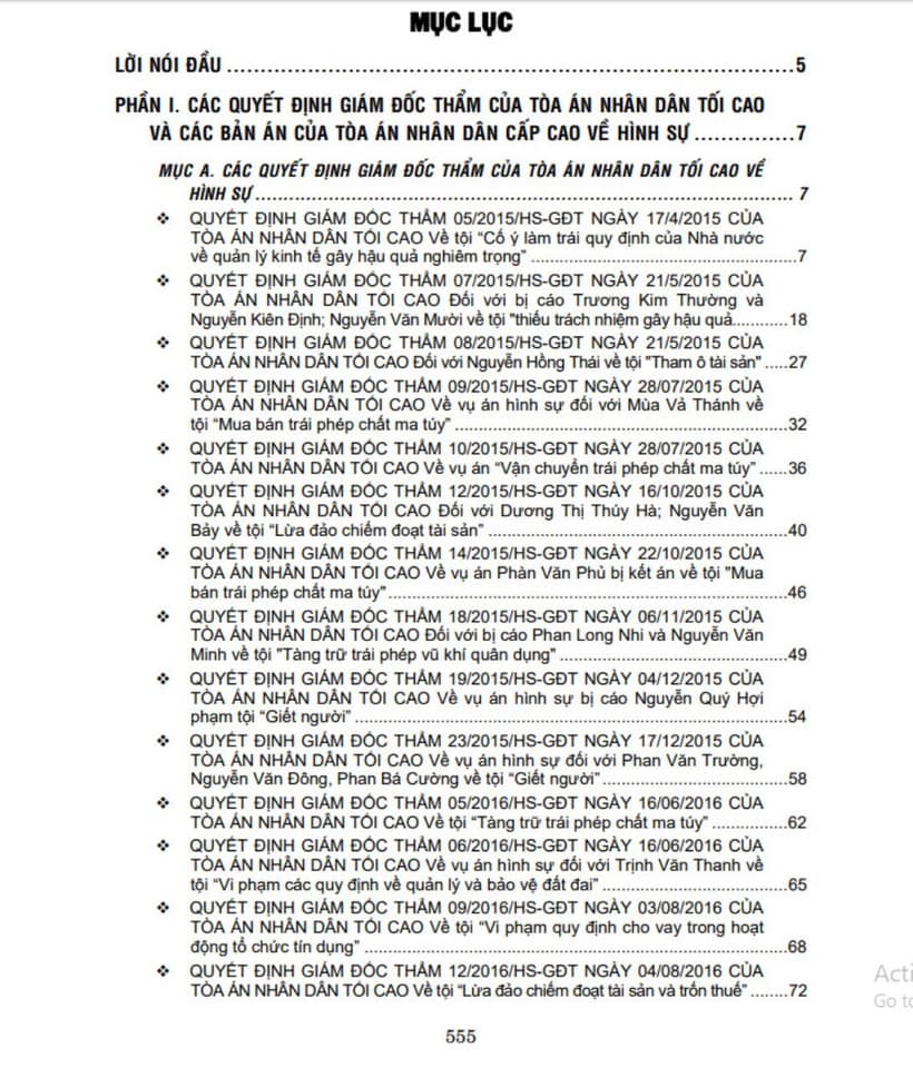 Hy vọng rằng đây sẽ là tài liệu hữu ích để bạn đọc, đặc biệt là các thẩm phán, hội thẩm, kiểm sát viên, điều tra viên, các học viên tư pháp, luật sư và những người làm công tác pháp luật nghiên cứu, áp dụng trong thực tiễn xét xử.